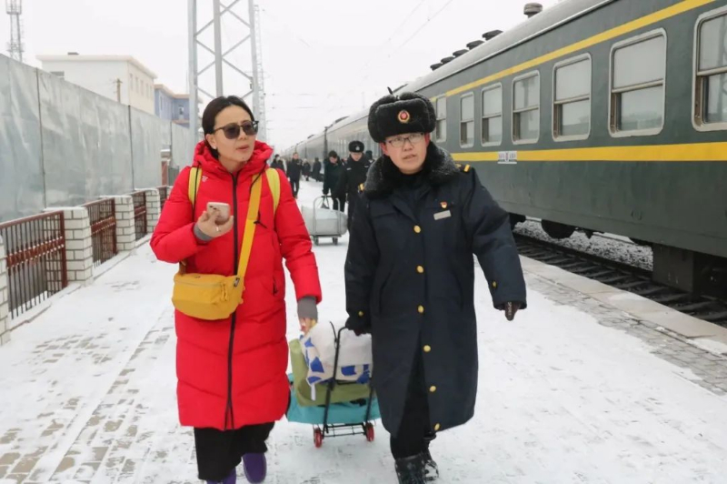 吴颖内蒙古集宁车务段职工帮助旅客提拿行李。