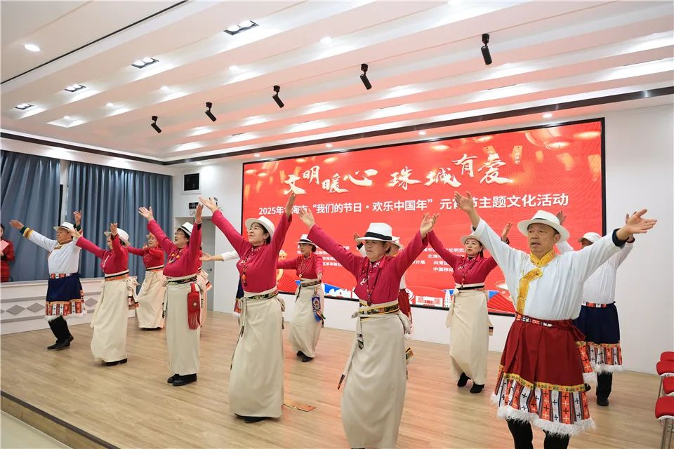 活动由热闹的锅庄舞《欢腾的草原》拉开帷幕,舞者们欢快的舞步瞬间点燃了现场气氛,展现出北海市民团结一心、共度佳节的喜悦。