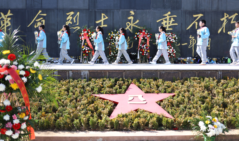 4月1日,在四川省阆中市红军烈士纪念园,学生向英名墙献花。新华社发(王玉贵摄)