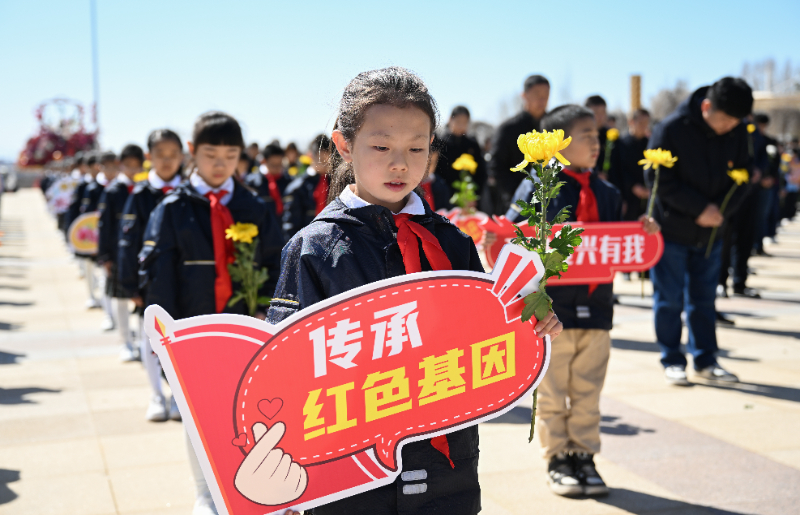 4月2日,学生在黑龙江省佳木斯市西林公园革命纪念塔前向英烈献花。新华社发(陈志国摄)