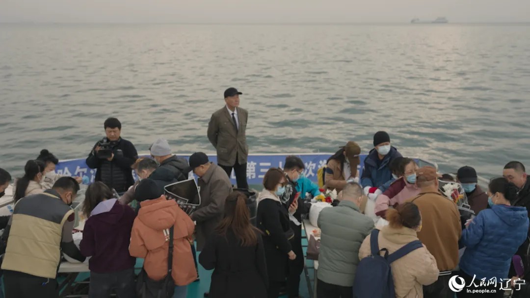 鸣笛三声,海葬船离开码头,驶向黄海。逝者家属安冬莉在船尾用力抛撒着饼干渣,吸引一大群海鸥紧跟随船的尾部。安冬莉与家人连夜从内蒙古驱车赶来,“我们那没有海,老父亲就喜欢海。”安冬莉遵循老父亲的心愿,入海为安。