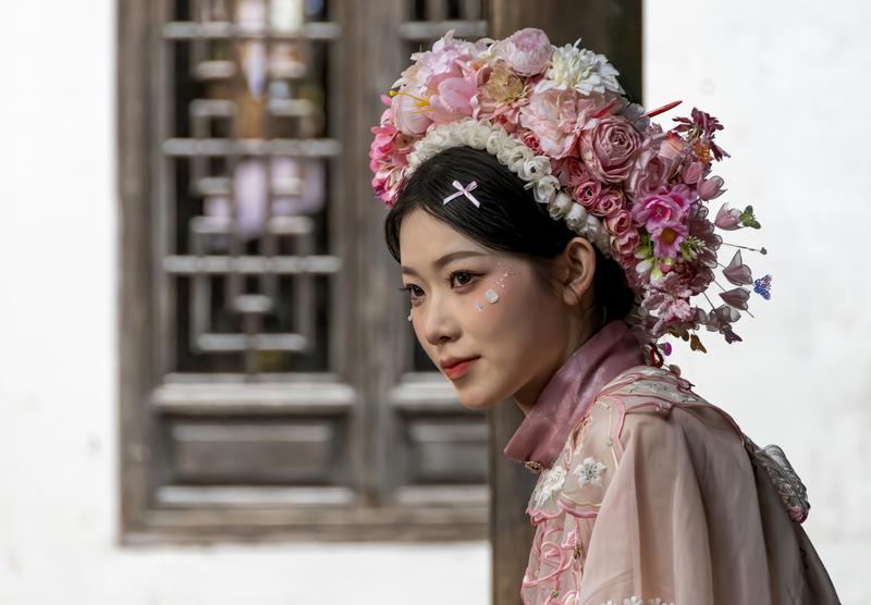 一名游客头戴“簪花”在福州市三坊七巷打卡留影(2月3日摄)。新华社记者 魏培全 摄