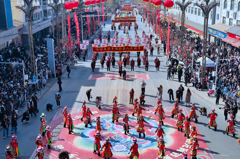 高空俯瞰,巡游队伍绵延数里,色彩鲜艳的表演方阵与两侧摩肩接踵的人群相映成趣,场面壮观震撼。祥龙腾飞、昂首摆尾,在表演者手中灵活翻飞,气势十足;舞狮腾跃、憨态可掬,引得现场观众阵阵欢呼;青海特色高抬艺术惊艳亮相,孩童扮成杨家将、西游记等经典形象,悬于高空、立于方寸,“高、悬、妙、奇”的巧思让观众连连惊叹。