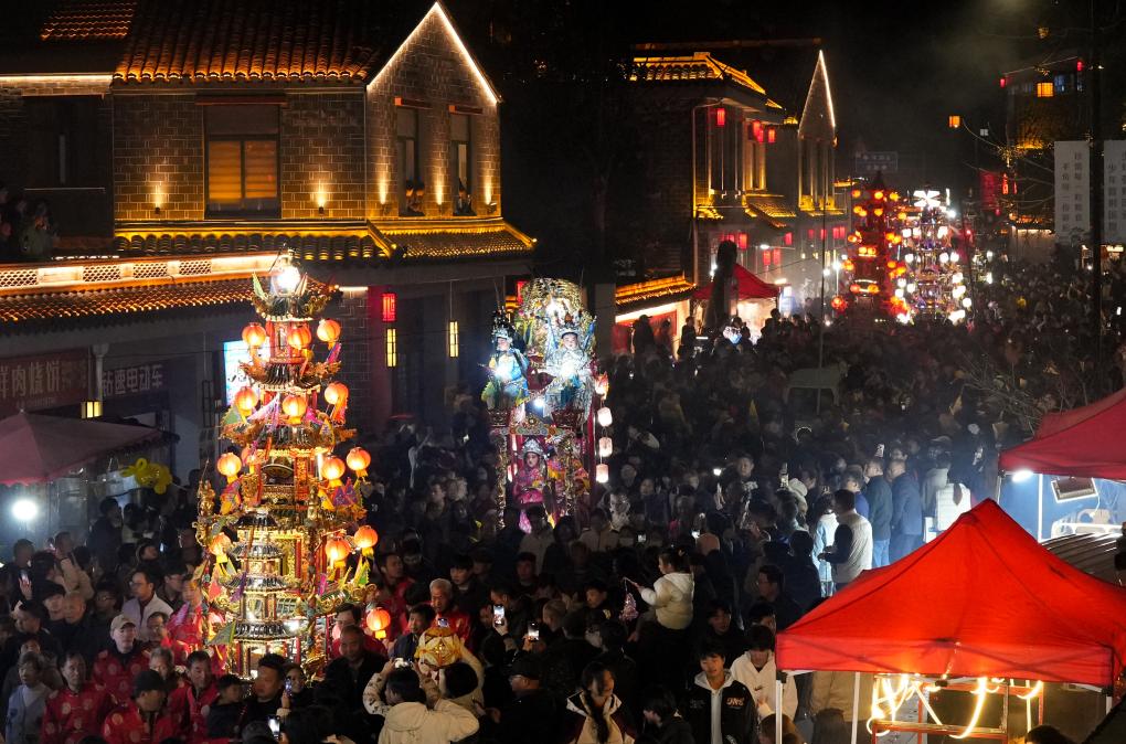 3月2日,浙江省宁海县前童古镇举行传统元宵行会,人们抬着鼓亭参加巡游。新华社记者 翁忻旸 摄