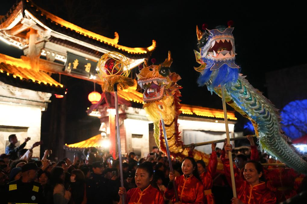 3月1日,村民在安徽省黄山市歙县溪头镇汪满田村嬉鱼灯。新华社发(施亚磊摄)