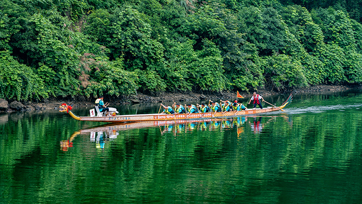 冲波突出人齐喊,跃浪争先鸟退飞。