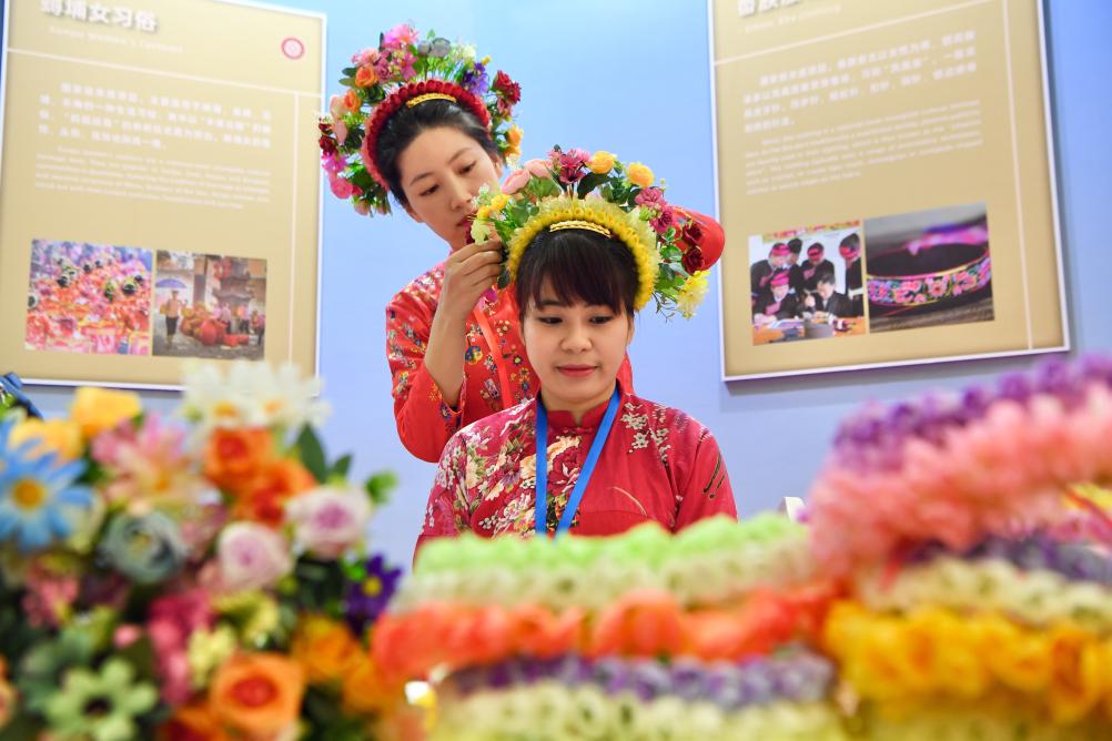 2月2日,两名女孩在2024中国-东盟人文交流年展览活动上展示福建蟳埔女头饰。新华社记者 姜克红 摄