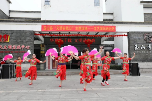“文明实践日,文艺进社区。下面有请文艺爱好者为观众带来精心准备的舞蹈……”在玉山县新时代文明实践中心,一场热闹的文艺演出正在上演,腰鼓舞、女声独唱、广场舞轮番登场,吸引来不少群众驻足观看,现场掌声不断、热闹非凡。
