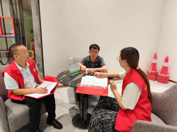 外卖小哥在光明社区新时代文明实践点接受问卷调查。