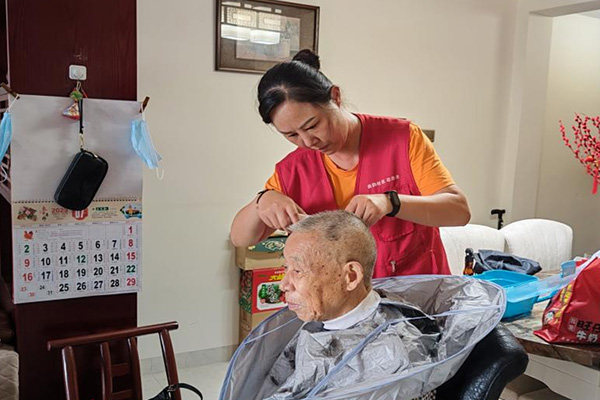 志愿者上门为老人理发。