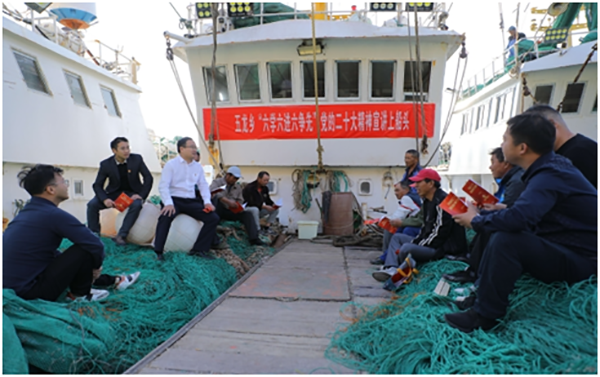 随后,五龙乡党委书记丁维东走上船头,开展党的二十大精神宣讲活动。丁维东热情洋溢,将会议精神细化为一个个短、小、实的“微话题”,结合当前渔民重视和关心的问题进行剖析,以“小切口”讲“大道理”,用拉家常式的“微宣讲”对党的二十大精神进行了深入解读,用乡音海话讲解了党的二十大重要概述,让渔民朋友倍感振奋,人群中不时发出阵阵掌声……