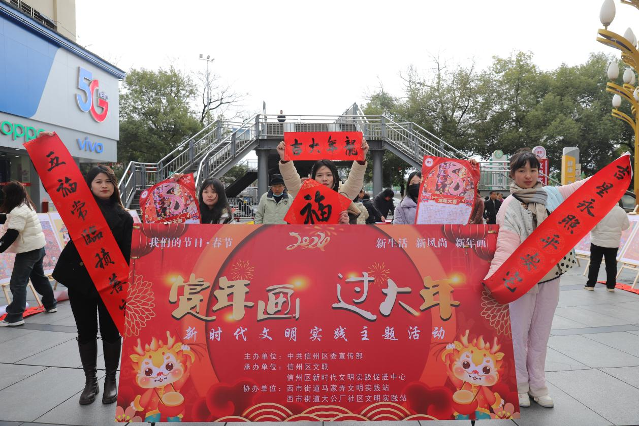 江西省上饶市信州区“赏年画 过大年——新时代文明实践主题活动”在步行街桥头铜钱广场举行。活动现场,红马甲志愿者为市民普及年画知识,并赠送龙年挂历,前来观展的群众不仅能够近距离观看年画作品,收获新春祝福,还能深层次了解传统年俗。