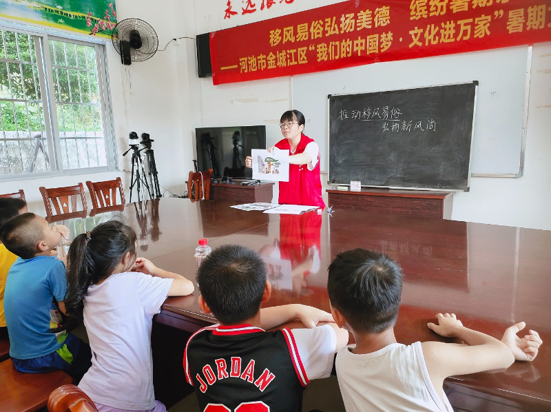 2023年7月25日,金城江区六圩镇大丈村志愿者给乡村孩子们开展移风易俗知识及移风易俗简笔画授课。