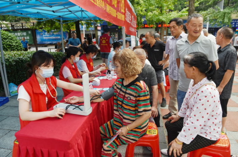 志愿者在邻居节活动现场为居民检查身体。