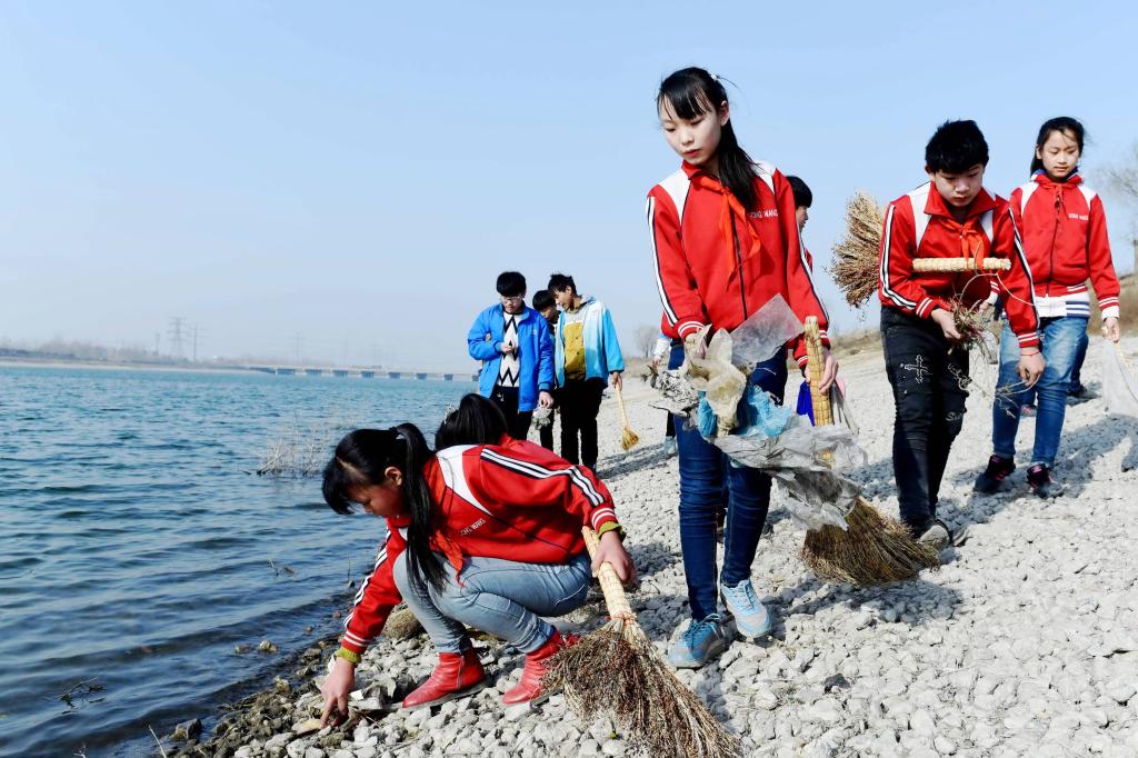 2016年3月3日,河北省邢台市经济开发区东汪镇中学学雷锋志愿小组在七里河沿岸捡拾垃圾。