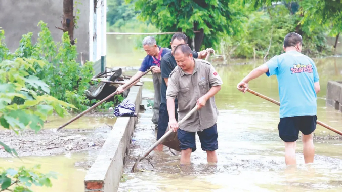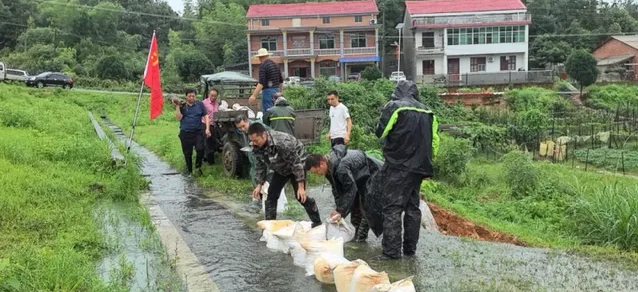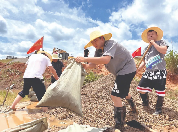 岳阳县新开镇文明实践志愿者奋战在防汛抢险一线。