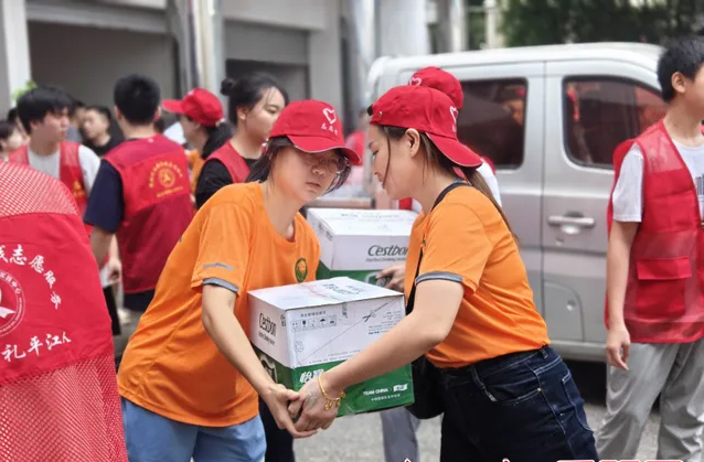 平江县新时代文明实践中心组织志愿者搬送救灾物资。