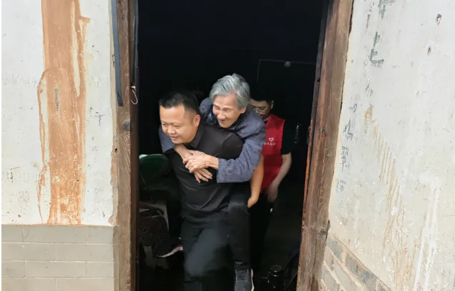 平江县岑川镇新时代文明实践所组织志愿者在大义村转移受困老人。