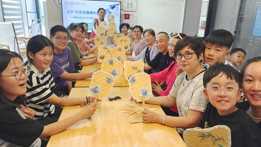 江苏省南京市江宁区东山街道龙西社区新时代文明实践站组织开展“我们的节日·七夕”——“巧手非遗编制扇”主题活动,现场氛围温馨,居民们在欢声笑语中体验非遗文化的独特魅力。