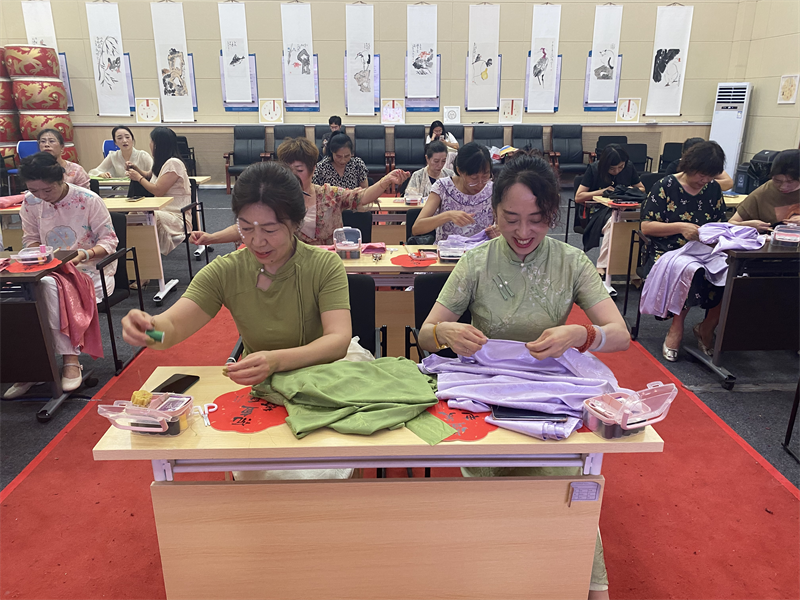 8月6日上午,山东省青岛市崂山区沙子口街道新时代文明实践所举办“我在文明实践中心过七夕”文明实践活动。在中国传统服装设计师的指导下,居民拿起手中工具仔细地缝制,一件件精美的宋式旋裙逐渐成形。