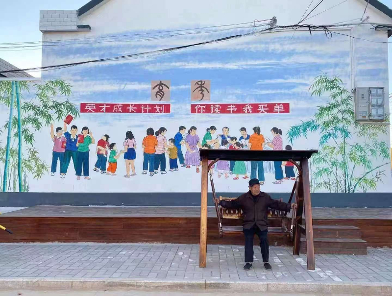 一位老人在街道边休息,在他身后是一面宣传孙协村“英才成长”助学计划的文化墙。