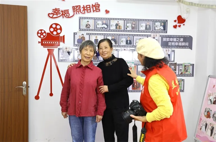 屯溪区昱中街道“幸福照相馆”文明实践志愿者为群众免费拍照。