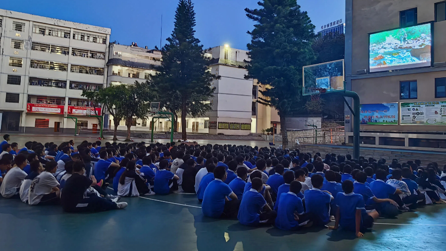 学生在操场上观看影片《我本是高山》。