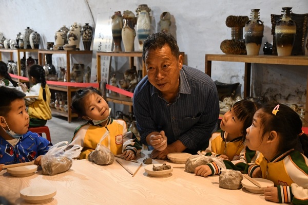 在峰峰矿区磁州窑盐店遗址博物馆,国家级非遗项目技艺国家级代表性传承人刘立忠给孩子们讲述磁州窑烧制技艺。李栋摄