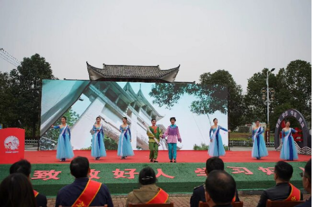 “安庆好人”宣讲进农村暨文艺助力乡村振兴文明实践活动之黄梅歌舞《六尺巷》表演。