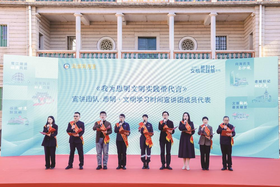 思明·文明学习时间宣讲团成员为文明实践带代言。