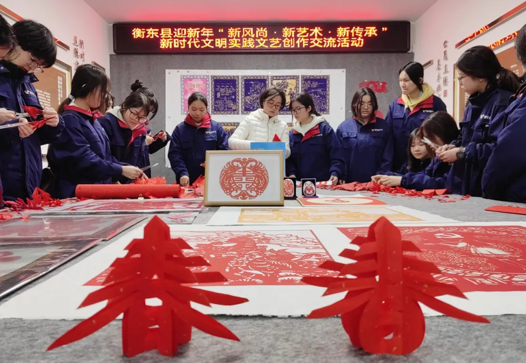 湖南省衡阳市衡东县在新时代文明实践中心开展迎新年“新风尚·新艺术·新传承”新时代文明实践文艺创作交流活动。剪纸艺术家们指尖灵动,纸屑纷飞,瞬间剪出寓意吉祥的精美图案,生肖福字活灵活现,其独特魅力令人倾倒。艺术家热情传授技巧,艺术爱好者积极参与体验,气氛热烈欢快。