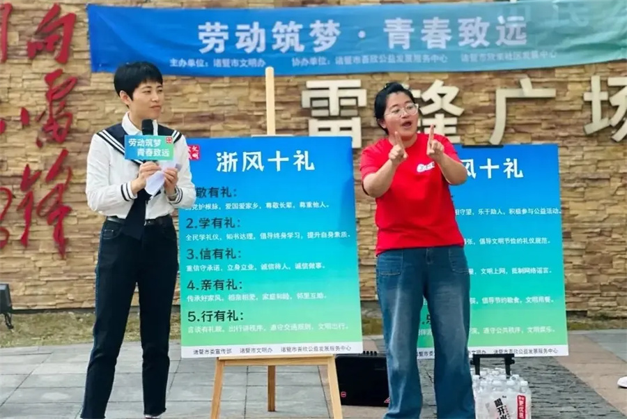5月1日,浙江诸暨新时代文明实践中心气氛热烈,“浙礼‘枫’行 —— 文明游学成长计划” 之 “劳动筑梦・青春致远” 主题活动在此热闹开展,吸引了多组亲子家庭、好少年及志愿者等60余人参与,共同度过了一个有意义的节日。活动以 “浙风十礼” 文明教育拉开序幕,公益志愿者通过趣味互动与情景故事,将 “敬有礼、学有礼” 等礼仪规范转化为青少年易于理解的生活场景,引导大家将文明礼仪融入日常生活的点点滴滴。活动现场还为合唱团2名成员授予聘书,期待他们持续以艺术传播正能量,鼓励青少年勇担社会责任,争做文明实践的先锋。