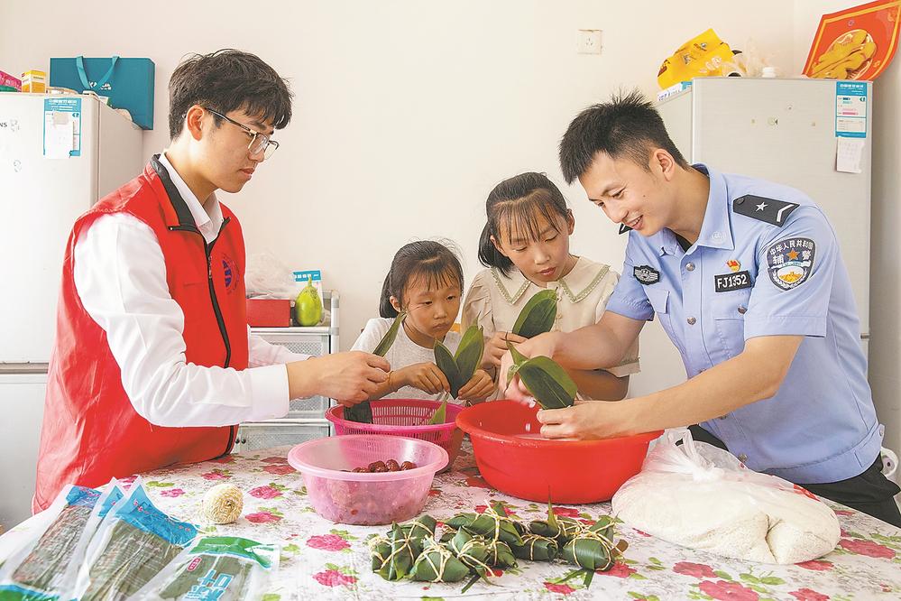 在襄阳市襄城区尹集乡白云人家社区,襄城区公安分局民警、湖北文理学院理工学院学生志愿者教小朋友包粽子。李旭晖 摄 图片来源:襄阳日报