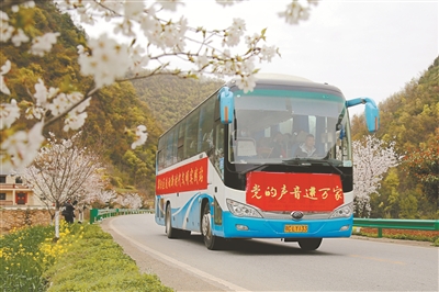 郧阳区“流动新时代文明实践站”大巴车行驶在乡村道路上。郧阳区委宣传部供图