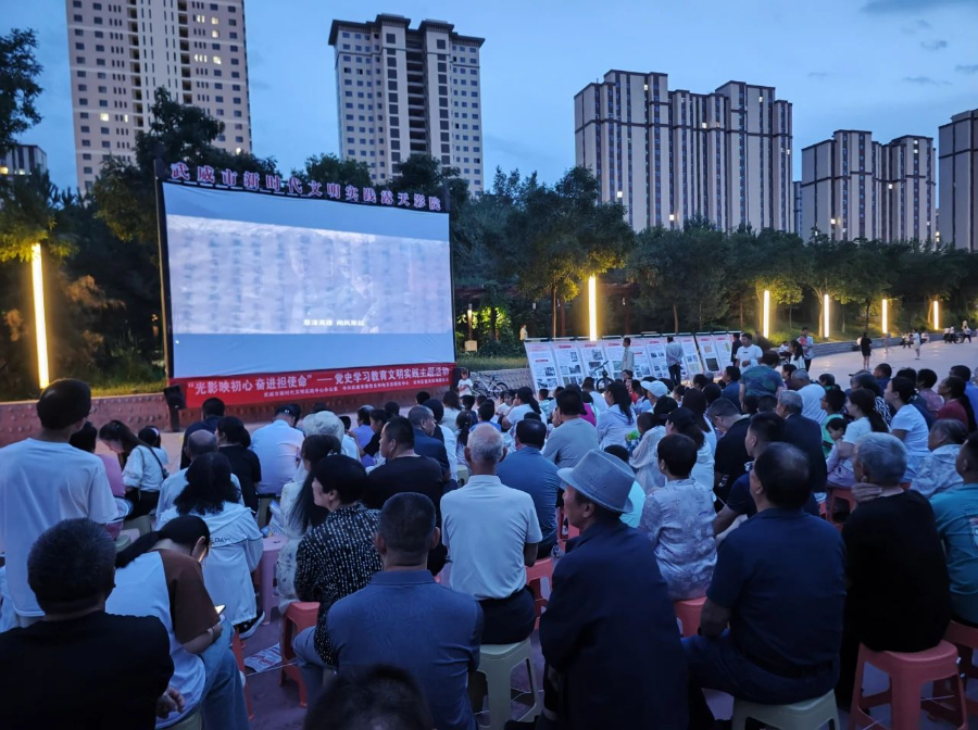 近日,甘肃省武威市“光影映初心 奋进担使命”党史学习教育文明实践主题活动在凉州区海藏湿地公园的露天影院成功举办。活动吸引了数百名市民群众、党员干部及学生踊跃参与,以光影为媒、以知识为桥,共赴一场沉浸式革命文化之旅。