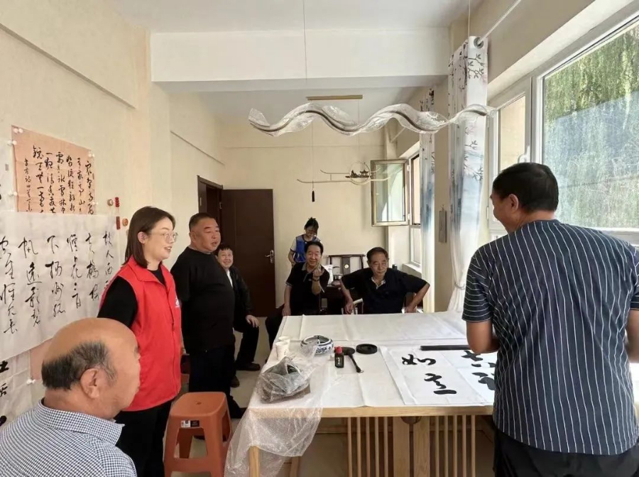 居民在新时代文明实践站内交流书法习作心得。
