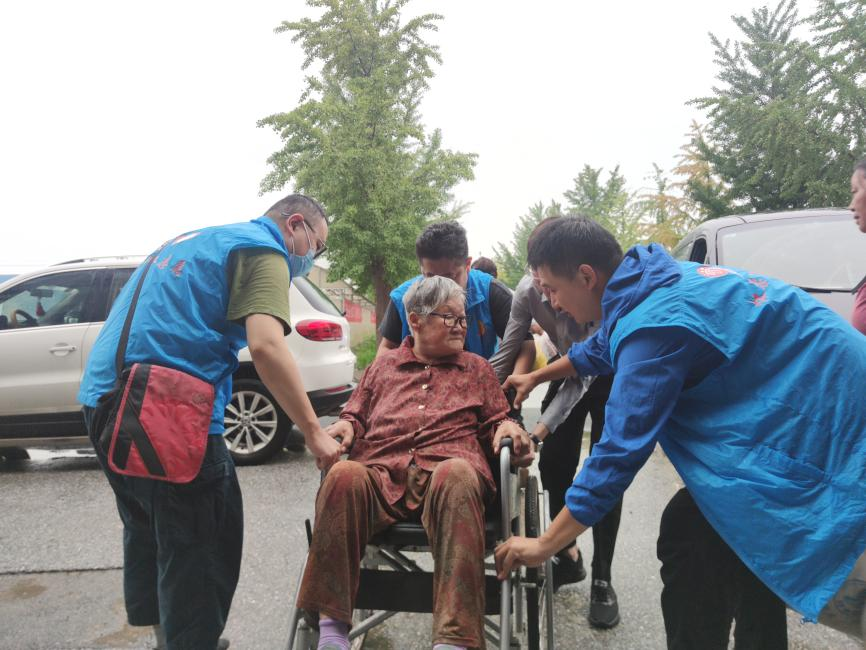防洪志愿服务突击队志愿者合力搀扶转移人员。图片来源:怀柔区总工会