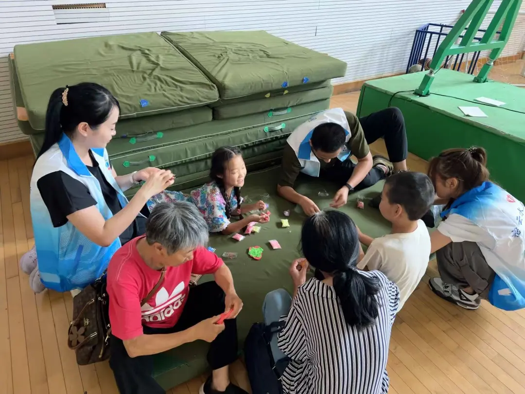 密云区志愿者陪伴安置点内的孩子们做手工、玩游戏。图片来源:共青团北京市密云区委员会
