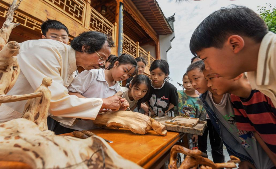 永新县非遗传承人汪擎昊在莲洲书院进行木雕技艺授课。图片来源:江西文明网