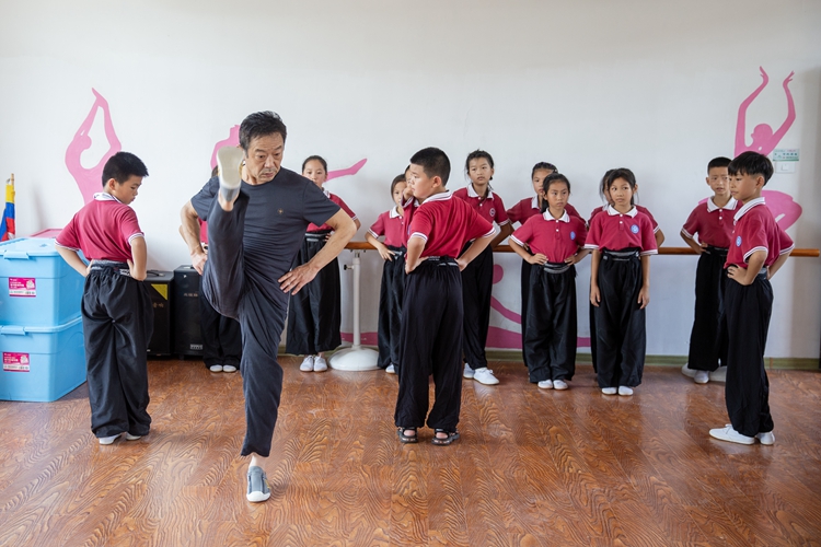 7月23日,咸宁市咸安区汀泗桥镇小学戏曲老师、楚剧团退休演员郝利明给孩子们做课堂示范。新华网 钟奕 摄