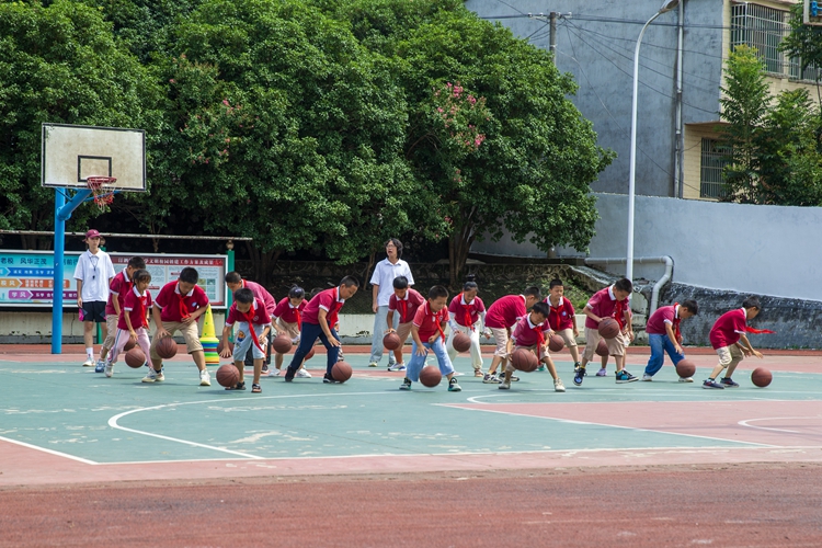 7月23日,咸宁市咸安区汀泗桥镇小学“七彩假期”活动开展篮球训练。新华网 钟奕 摄