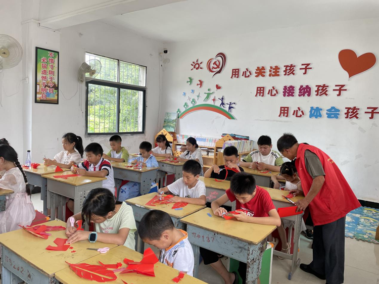 汀泗桥镇洪口村“四点半学校”的孩子们在老师的指导下学习剪纸,教室外整齐地展示着孩子们书法、绘画作品。