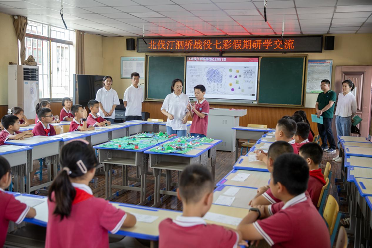 7月23日,中南民族大学“种太阳志愿团”大学生志愿者在咸宁市咸安区汀泗桥镇小学进行“北伐汀泗桥战役”研学交流。新华网 钟奕 摄