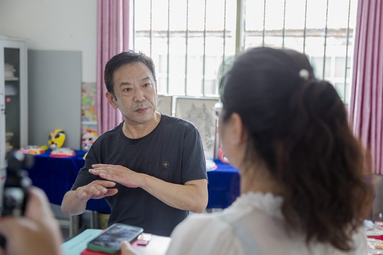 7月23日,咸宁市咸安区汀泗桥镇小学戏曲老师、楚剧团退休演员郝利明介绍戏曲进课堂教学情况。新华网 钟奕 摄