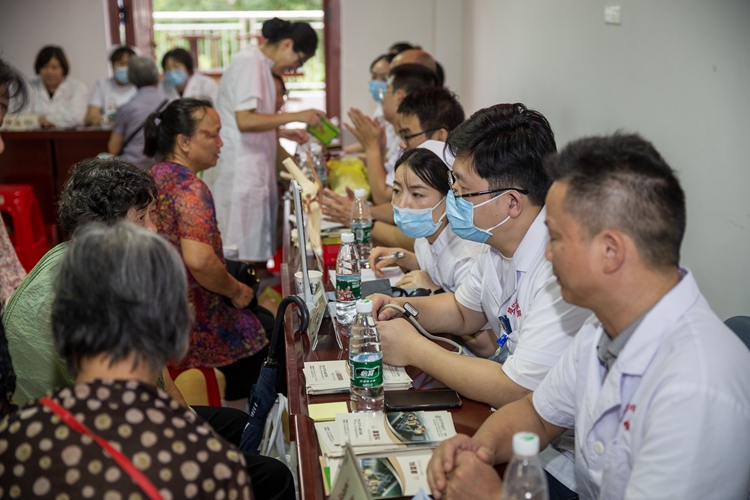 7月22日,咸宁市咸安区温泉街道南昌路社区举办的中医药文化集市活动现场坐满了来问诊的居民。新华网 钟奕 摄