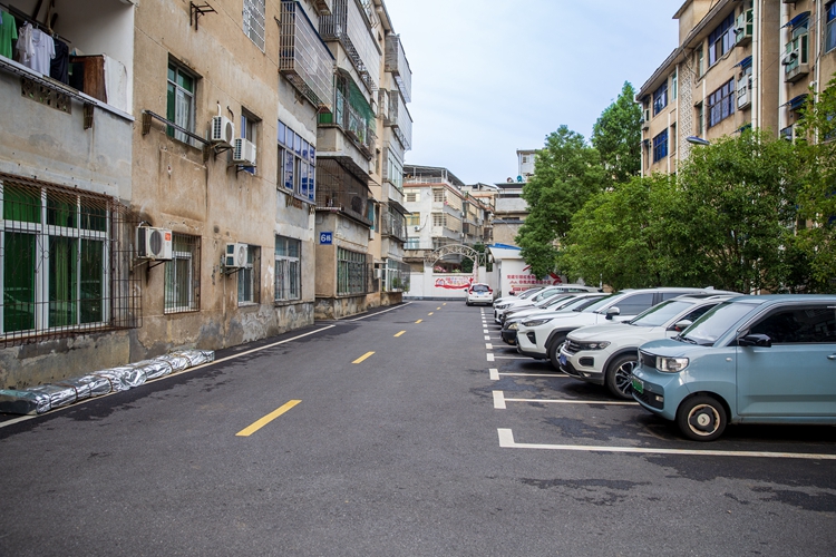 7月22日,咸宁市咸安区温泉街道南昌路社区改造后,路面平坦,停车规范。新华网 钟奕 摄