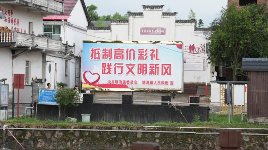 7月18日,在江西省贵溪市塘湾镇唐甸村,标语上墙倡导新婚俗。在婚俗改革的不断推动下,该镇涌现了一大批零彩礼、低彩礼的典型事例。新华网发 郭梓崧 摄