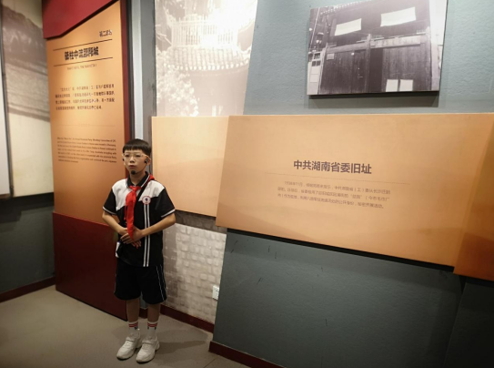 在八路军驻湘通讯处旧址采访时,记者遇到了一群来自洛阳洞小学的小小解说员,他们引导大家参观文物主楼和展览厅,用每个人负责几块展板一个个接力的方式,站在自己负责的文物、展板前生动地向大家介绍八路军驻湘通讯处的革命故事和革命先辈的事迹。