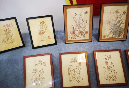 邵阳市柘木社区活动中心展示的孩子们自己制作的宝庆烙画(7月16日摄)。新华网记者 苏影 摄