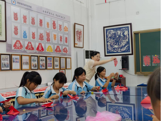 走进新邵县思源实验学校,红彤彤的剪纸长卷映入记者的眼帘,邵阳剪纸非遗传承人马丽娅正在开展剪纸教学,随着剪刀在红纸中穿梭流动,一幅幅各具特色的剪纸在同学们的手中呈现。“我除了带学生外,还培养了30多名老师,这些老师到所任教的班级开展剪纸教学,用这种方式可以更大地扩大剪纸的影响力,让更多的人能够学习到剪纸文化。”马丽娅一谈到剪纸就滔滔不绝,“每个孩子通过学习后,也会把剪纸技艺教给身边的家长、朋友,可以说每个老师都在做非遗的传承,每个学生都在做非遗的传播。”